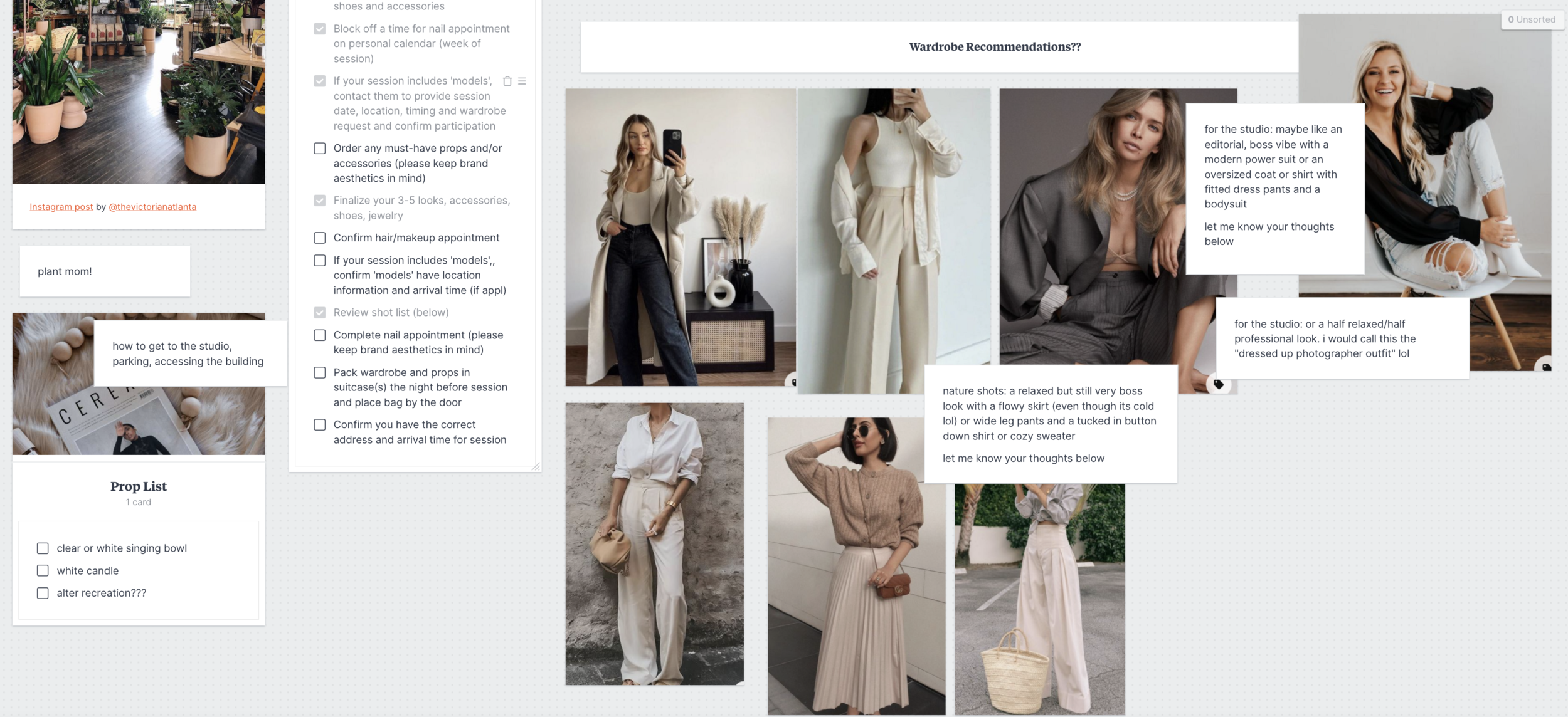 We create our session prep boards in Milanote. One thing we love about Milanote is it is easy to use + super interactive. You can add images, notes, links to website pages you’d like to share, and our favorite feature of all, the handy dandy checklist. We love to add information about our studio, things to remember to do before the session, and makeup stylist recommendations.